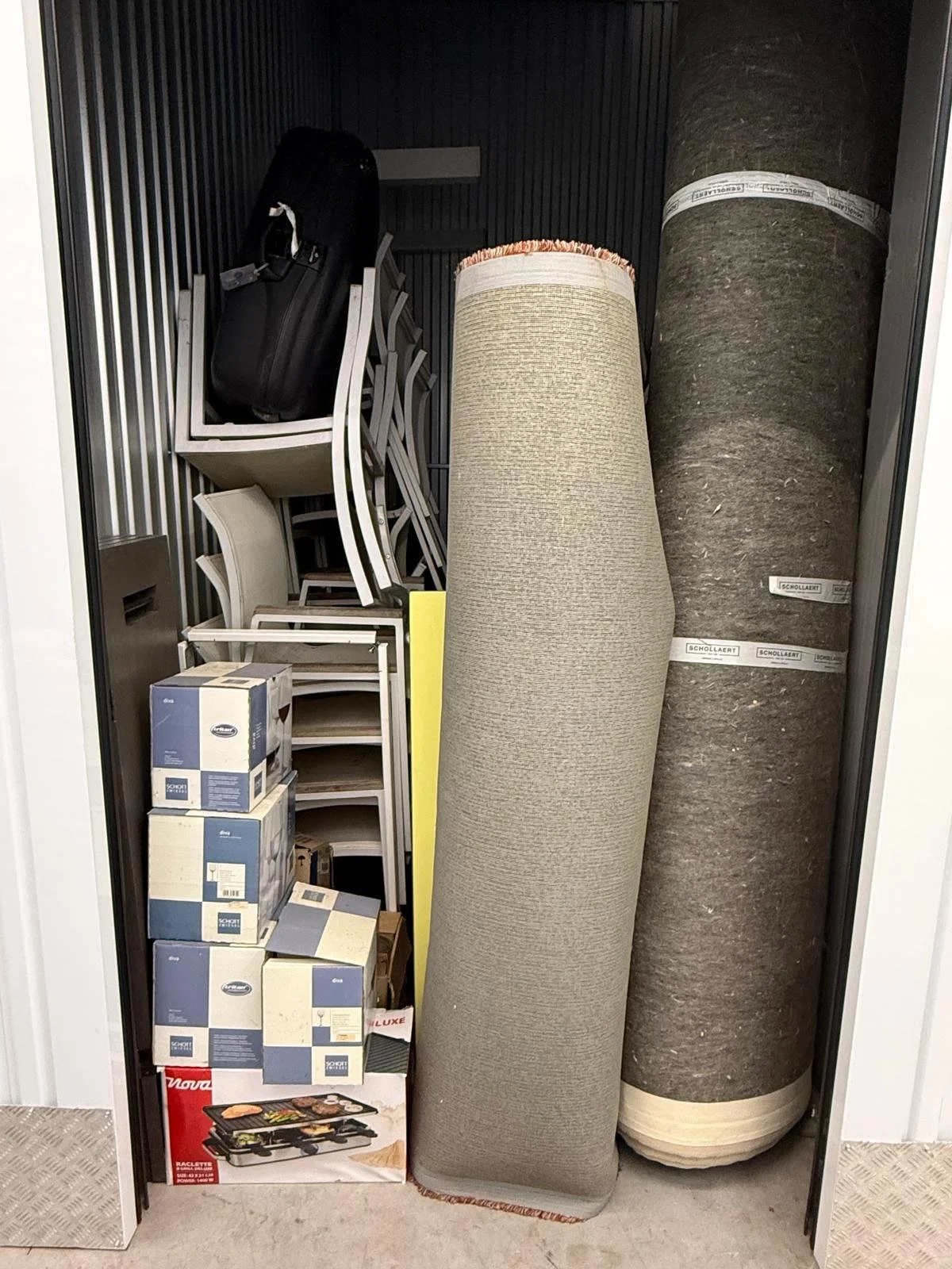De foto’s zeggen genoeg. Een volle unit met vele bruikbare spullen zoals tapijten, (wijn)glazen, terrasstoelen en nog zoveel meer.